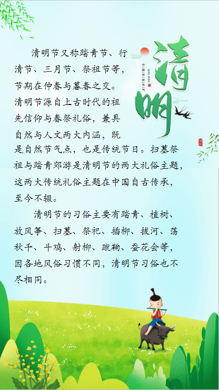 清明节将至,宽大党员干部、企业员工要提高政治站位,严酷落实中央八项划定精神和各项纪律,带动节俭文明清廉过节,带动提倡移风易俗,文明低碳祭扫,清廉清静过节,坚决杜绝“节日糜烂”,让清廉之风越发充裕,清明之节越发“清明”。